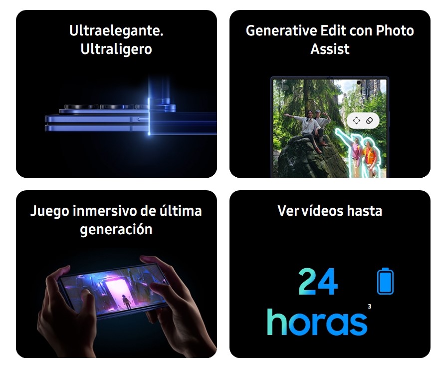 - Construcción: Frontal de cristal (Gorilla Glass Victus Ceramic 2) (plegado), frontal de plástico (desplegado), trasera de cristal (Gorilla Glass Victus 2), marco de aluminio
